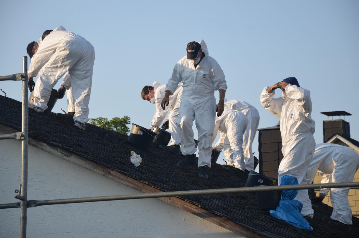Die Schutzkleidung war erforderlich, wegen der gesundheitsgefährdenden Stoffe, die beim Abnehmen der Kunstschieferplatten freigesetzt werden könnten. Durch diese Schutzmaßnahmen wurde die Arbeit nicht gerade erleichtert. Es war jedenfalls kein Vergnügen bei schönstem Sonnenschein in diesen „staubdichten“ Anzügen zu stecken und dazu noch eine Atemmaske vorm Gesicht zu haben. Trotzdem gingen die Arbeiten fast unerwartet zügig voran und schon gegen Mittag war das Dach komplett abgedeckt und alle Schieferplatten in speziellen großen Säcken auf dem Anhänger von Löcks-Fendt 415 verstaut und verpackt.