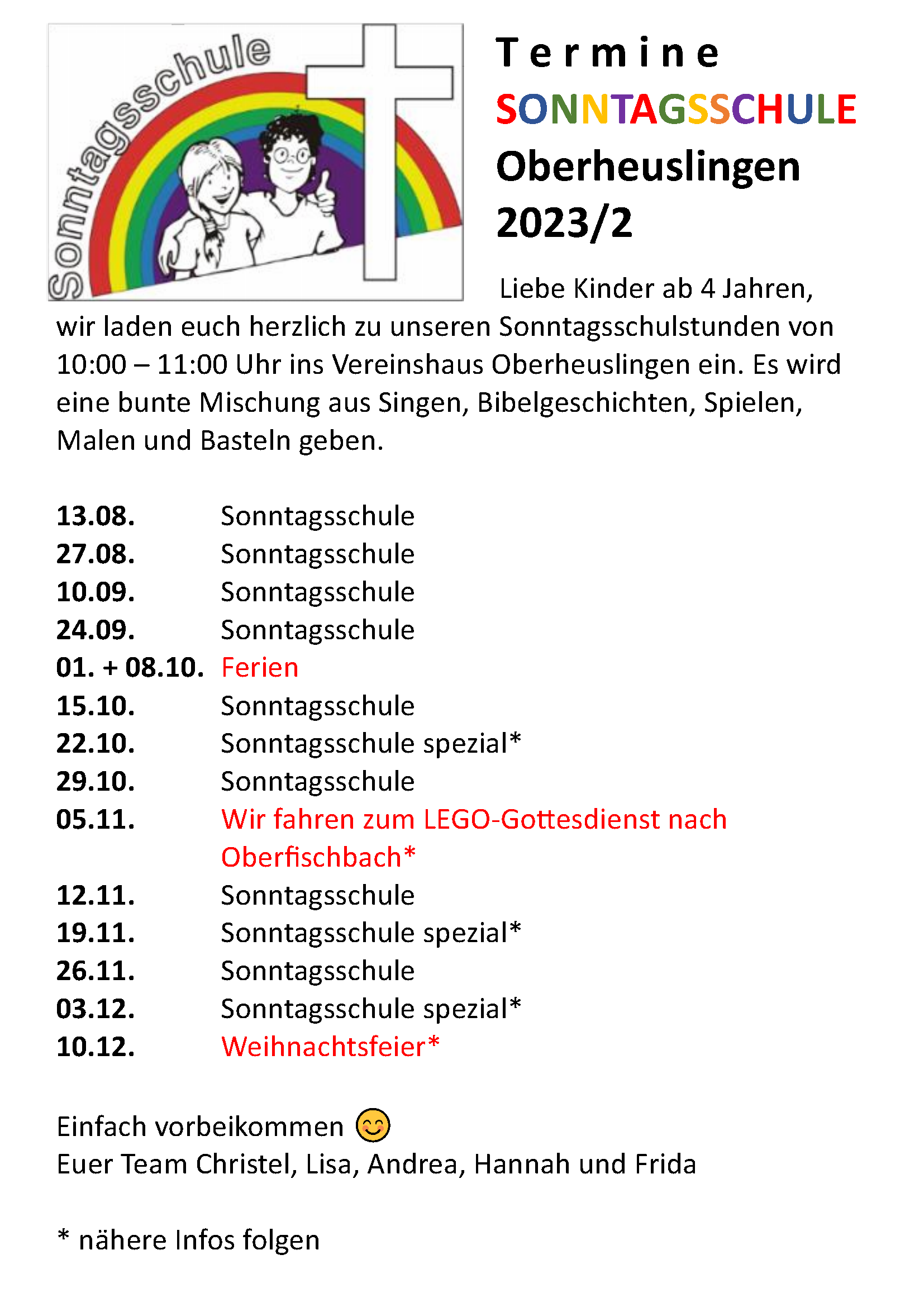 wir laden euch herzlich zu unseren Sonntagsschulstunden von 10:00 – 11:00 Uhr ins Vereinshaus Oberheuslingen ein. Es wird eine bunte Mischung aus Singen, Bibelgeschichten, Spielen, Malen und Basteln geben.