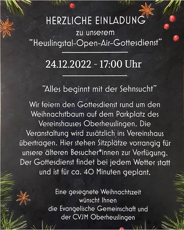 HeiligAbend-GD Verfasst am 15. Dezember 2022. Herzliche Einladung zu unserem Open-Air-Gottesdienst mit Pfarrer Matthias Elsermann am Sa. 24.12.2022, 17:00 Uhr vor dem Ev. Vereinshaus Oberheuslingen. Zurück Weiter