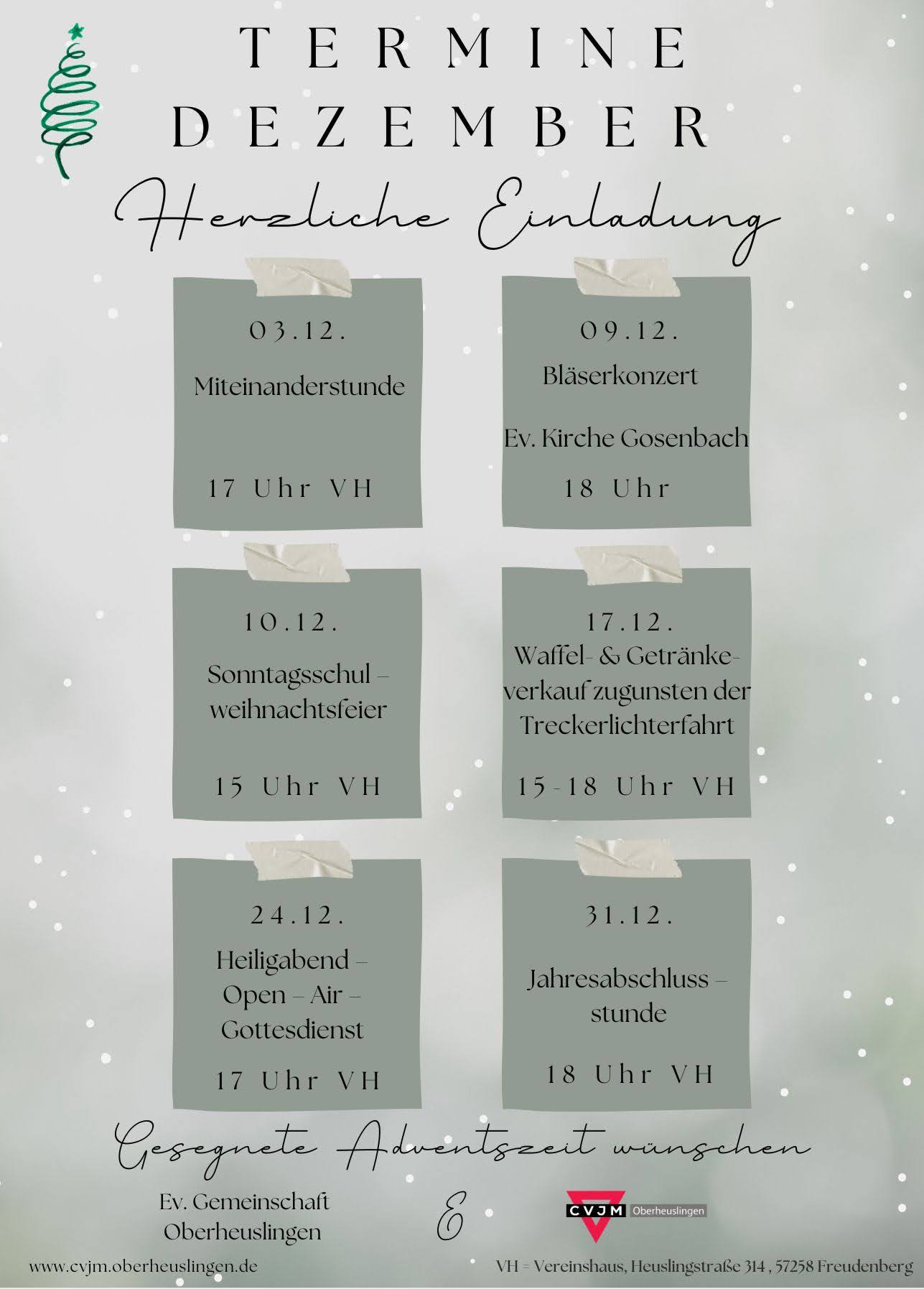 Termine im Dez 2023 Verfasst am 28. November 2023. Herzliche Einladung zu unseren Veranstaltungen im Dezember 2023. Zurück Weiter