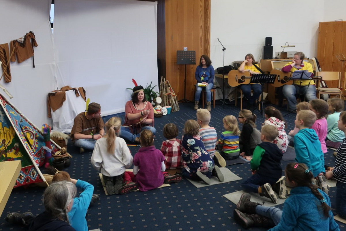 Über 90 Kinder begrüßten sich täglich mit Indianergeheul, gingen mit "Kleiner Hasenfuß" auf Bärenjagd, entlarvten dabei den Spruch "Indianer kennen keine Angst" als falsch und lauschten gespannt auf biblische Geschichten. Marion Plag vom Bibellesebund erzählte. In 3 Gruppen wurden anschließend zusammen mit dem engagierten Team der Sonntagsschulen aus Bottenberg, Heuslingen und Oberfischbach passende Eintragungen ins Stammesbuch gemacht. Die Kindertrefftage und der abschließende Familiengottesdienst in der Kirche Oberfischbach waren auch dieses Jahr wieder eine großartige Sache.